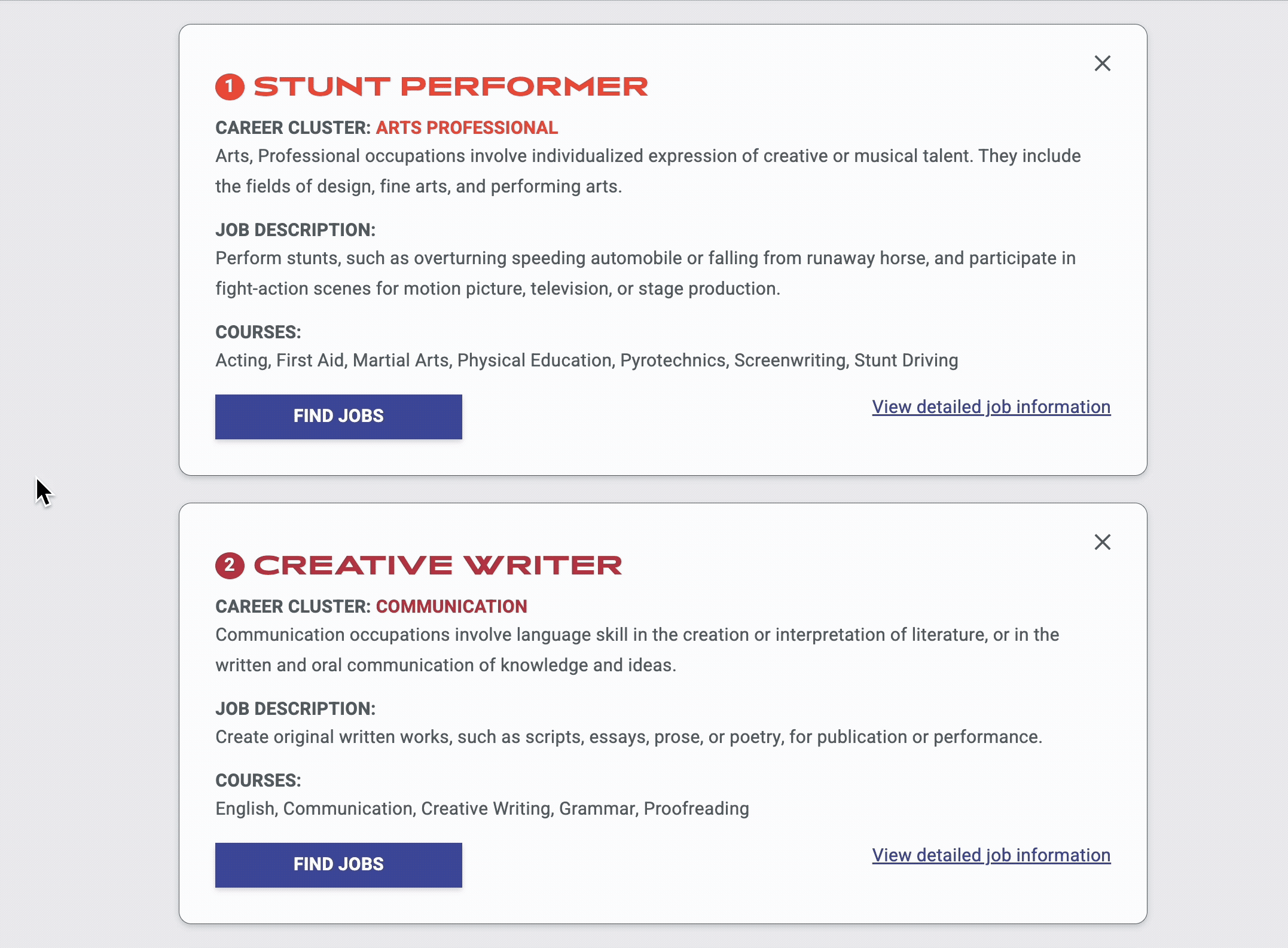 Delve into detailed information about each of your top jobs, including salary information, required training, specific skills, links to the Occupational Information Network (O*NET), and even job postings in your area!